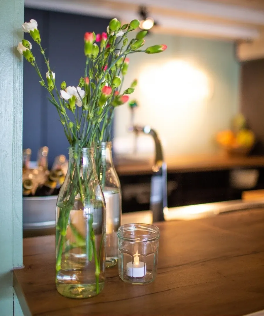 - Op te delen gemeenschappelijke ruimte. In de gemeenschappelijke ruimte kunt u gezamenlijk eten, loungen en in de avond de bar gebruiken. Via de openslaande deuren bent u direct op het buitenterras waar de picknicktafels staan.