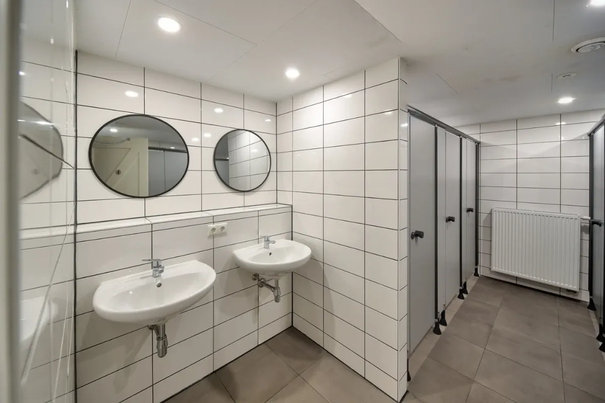 - Heren sanitair: 3 toiletten, 4 douches, 2 wastafels
